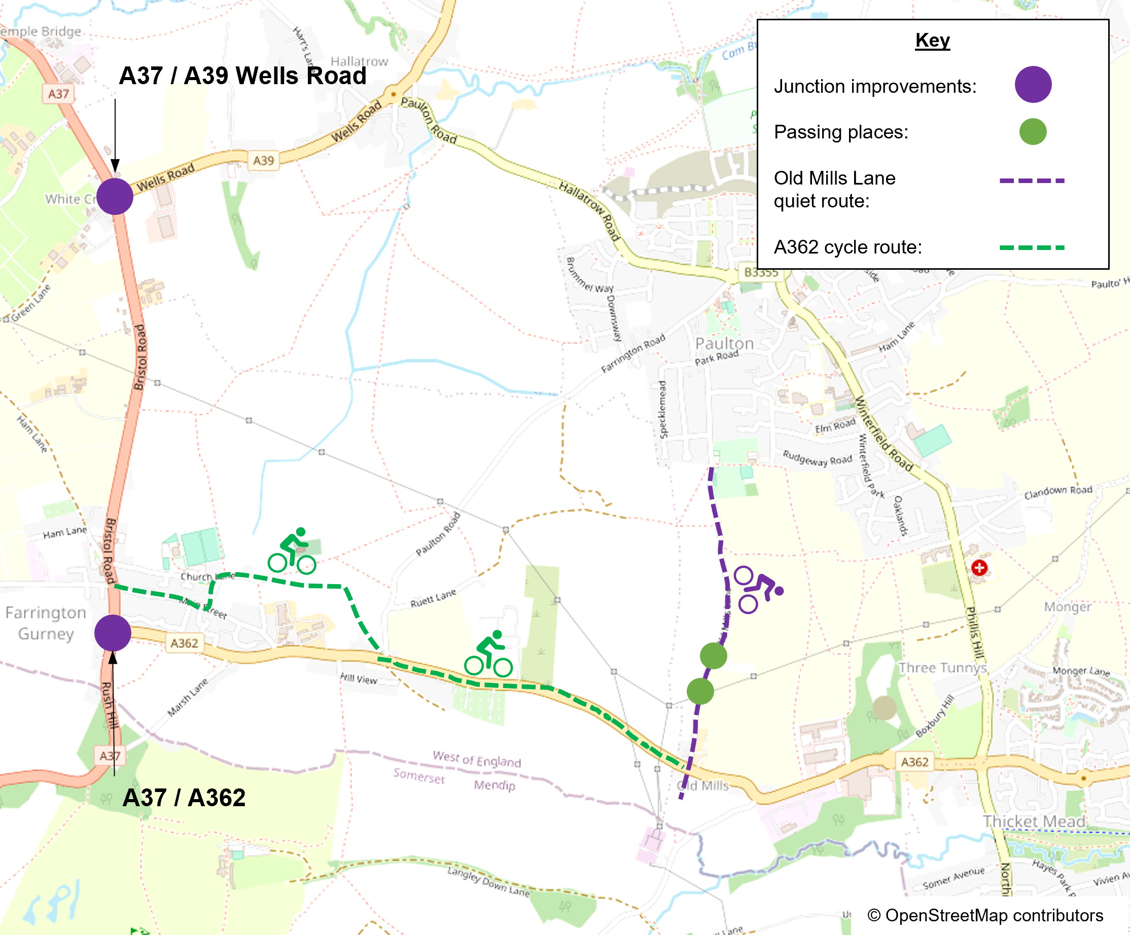 - Convert Old Mills Lane into a ‘quiet route’ connecting Paulton to the A362. This would be closed to traffic except landowners and people walking, wheeling or cycling