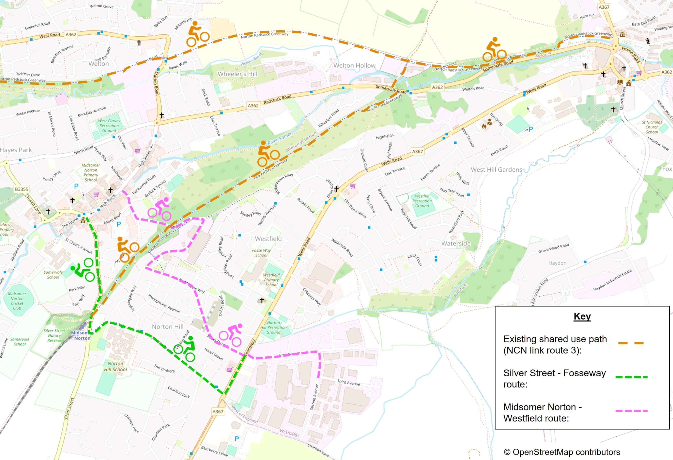 - Improve cycle links between residential streets in Midsomer Norton and the Norton-Radstock greenway with a new shared use (for walking and cycling) route on First Avenue, Second Avenue, Excelsior Terrace, the B3355 and Charlton Road