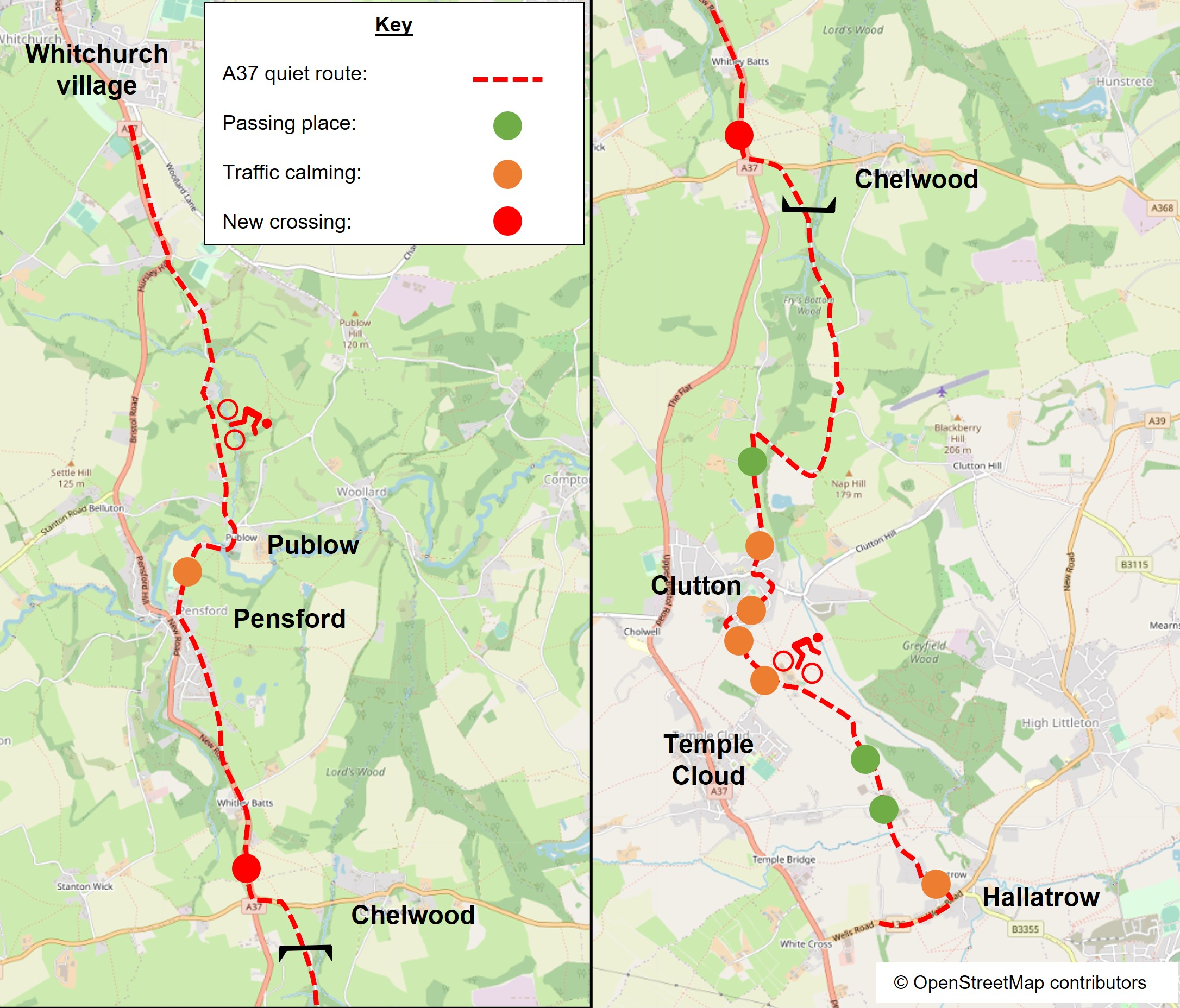 - Create a new cycling quiet route connecting Hallatrow, Clutton, Pensford, Publow and Whitchurch village as an alternative to the A37