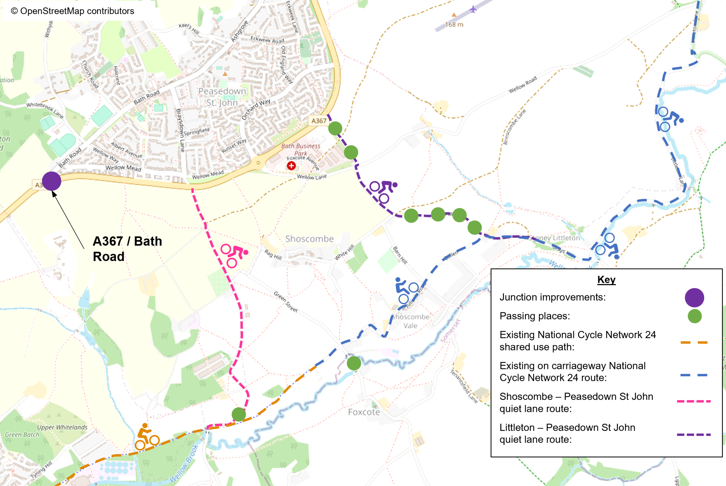 - Create a new quiet route linking Peasedown St John to the National Cycle Network route 24 via Shoscombe